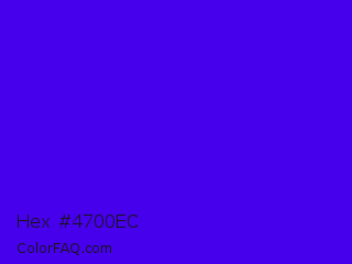 Hex #4700ec Color is a normal indigo color and the nearest color is Electric Ultramarine #3f00ff. Hex code #4700ec and RGB value is rgb(71,0,236). In RGB color space, this color is composed of 28% red, 0% green, 93% blue, In CMYK color space, this color is composed of 70% cyan, 100% magenta, 0% yellow , 7% black , In HSL color space, this color has a hue angle of 258° , 100% saturation and 46% lightness.