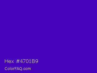 Hex #4701b9 Color is a normal violet color and the nearest color is Interdimensional Blue #360ccc. Hex code #4701b9 and RGB value is rgb(71,1,185). In RGB color space, this color is composed of 28% red, 0% green, 73% blue, In CMYK color space, this color is composed of 62% cyan, 99% magenta, 0% yellow , 27% black , In HSL color space, this color has a hue angle of 263° , 99% saturation and 36% lightness.