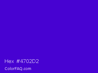 Hex #4702d2 Color is a normal indigo color and the nearest color is Interdimensional Blue #360ccc. Hex code #4702d2 and RGB value is rgb(71,2,210). In RGB color space, this color is composed of 28% red, 1% green, 82% blue, In CMYK color space, this color is composed of 66% cyan, 99% magenta, 0% yellow , 18% black , In HSL color space, this color has a hue angle of 260° , 98% saturation and 42% lightness.