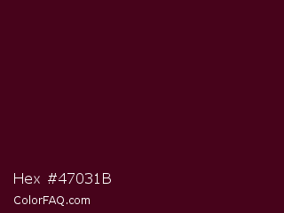 Hex #47031b Color is a very dark rose color and the nearest color is Cab Sav #4d0a18. Hex code #47031b and RGB value is rgb(71,3,27). In RGB color space, this color is composed of 28% red, 1% green, 11% blue, In CMYK color space, this color is composed of 0% cyan, 96% magenta, 62% yellow , 72% black , In HSL color space, this color has a hue angle of 339° , 92% saturation and 15% lightness.