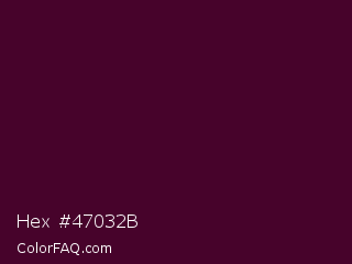 Hex #47032b Color is a very dark magenta color and the nearest color is Barossa #44012d. Hex code #47032b and RGB value is rgb(71,3,43). In RGB color space, this color is composed of 28% red, 1% green, 17% blue, In CMYK color space, this color is composed of 0% cyan, 96% magenta, 39% yellow , 72% black , In HSL color space, this color has a hue angle of 325° , 92% saturation and 15% lightness.