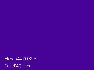 Hex #470398 Color is a dark violet color and the nearest color is Pigment Indigo #4b0082. Hex code #470398 and RGB value is rgb(71,3,152). In RGB color space, this color is composed of 28% red, 1% green, 60% blue, In CMYK color space, this color is composed of 53% cyan, 98% magenta, 0% yellow , 40% black , In HSL color space, this color has a hue angle of 267° , 96% saturation and 30% lightness.