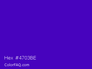 Hex #4703be Color is a normal violet color and the nearest color is Interdimensional Blue #360ccc. Hex code #4703be and RGB value is rgb(71,3,190). In RGB color space, this color is composed of 28% red, 1% green, 75% blue, In CMYK color space, this color is composed of 63% cyan, 98% magenta, 0% yellow , 25% black , In HSL color space, this color has a hue angle of 262° , 97% saturation and 38% lightness.