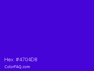 Hex #4704d8 Color is a normal indigo color and the nearest color is Interdimensional Blue #360ccc. Hex code #4704d8 and RGB value is rgb(71,4,216). In RGB color space, this color is composed of 28% red, 2% green, 85% blue, In CMYK color space, this color is composed of 67% cyan, 98% magenta, 0% yellow , 15% black , In HSL color space, this color has a hue angle of 259° , 96% saturation and 43% lightness.