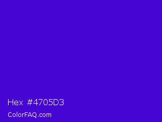 Hex #4705d3 Color is a normal indigo color and the nearest color is Interdimensional Blue #360ccc. Hex code #4705d3 and RGB value is rgb(71,5,211). In RGB color space, this color is composed of 28% red, 2% green, 83% blue, In CMYK color space, this color is composed of 66% cyan, 98% magenta, 0% yellow , 17% black , In HSL color space, this color has a hue angle of 259° , 95% saturation and 42% lightness.