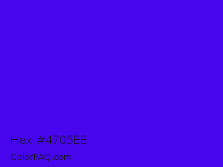 Hex #4705ee Color is a normal indigo color and the nearest color is Electric Ultramarine #3f00ff. Hex code #4705ee and RGB value is rgb(71,5,238). In RGB color space, this color is composed of 28% red, 2% green, 93% blue, In CMYK color space, this color is composed of 70% cyan, 98% magenta, 0% yellow , 7% black , In HSL color space, this color has a hue angle of 257° , 96% saturation and 48% lightness.