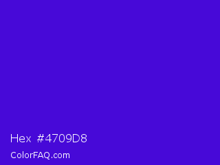 Hex #4709d8 Color is a normal indigo color and the nearest color is Interdimensional Blue #360ccc. Hex code #4709d8 and RGB value is rgb(71,9,216). In RGB color space, this color is composed of 28% red, 4% green, 85% blue, In CMYK color space, this color is composed of 67% cyan, 96% magenta, 0% yellow , 15% black , In HSL color space, this color has a hue angle of 258° , 92% saturation and 44% lightness.