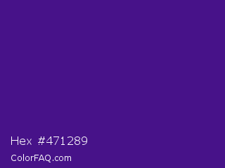 Hex #471289 Color is a dark violet color and the nearest color is Pixie Powder #391285. Hex code #471289 and RGB value is rgb(71,18,137). In RGB color space, this color is composed of 28% red, 7% green, 54% blue, In CMYK color space, this color is composed of 48% cyan, 87% magenta, 0% yellow , 46% black , In HSL color space, this color has a hue angle of 267° , 77% saturation and 30% lightness.