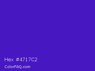 Hex #4717c2 Color is a normal indigo color and the nearest color is Interdimensional Blue #360ccc. Hex code #4717c2 and RGB value is rgb(71,23,194). In RGB color space, this color is composed of 28% red, 9% green, 76% blue, In CMYK color space, this color is composed of 63% cyan, 88% magenta, 0% yellow , 24% black , In HSL color space, this color has a hue angle of 257° , 79% saturation and 43% lightness.