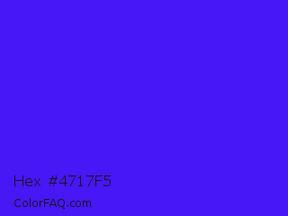 Hex #4717f5 Color is a normal indigo color and the nearest color is Han Purple #5218fa. Hex code #4717f5 and RGB value is rgb(71,23,245). In RGB color space, this color is composed of 28% red, 9% green, 96% blue, In CMYK color space, this color is composed of 71% cyan, 91% magenta, 0% yellow , 4% black , In HSL color space, this color has a hue angle of 253° , 92% saturation and 53% lightness.