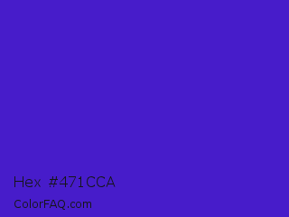Hex #471cca Color is a normal indigo color and the nearest color is Interdimensional Blue #360ccc. Hex code #471cca and RGB value is rgb(71,28,202). In RGB color space, this color is composed of 28% red, 11% green, 79% blue, In CMYK color space, this color is composed of 65% cyan, 86% magenta, 0% yellow , 21% black , In HSL color space, this color has a hue angle of 255° , 76% saturation and 45% lightness.