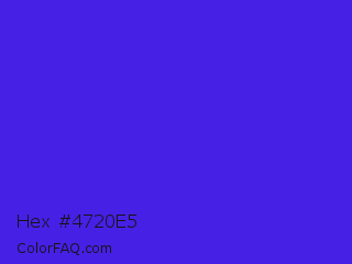 Hex #4720e5 Color is a normal indigo color and the nearest color is Han Purple #5218fa. Hex code #4720e5 and RGB value is rgb(71,32,229). In RGB color space, this color is composed of 28% red, 13% green, 90% blue, In CMYK color space, this color is composed of 69% cyan, 86% magenta, 0% yellow , 10% black , In HSL color space, this color has a hue angle of 252° , 79% saturation and 51% lightness.
