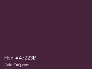 Hex #47223b Color is a very dark magenta color and the nearest color is Livid Brown #4d282e. Hex code #47223b and RGB value is rgb(71,34,59). In RGB color space, this color is composed of 28% red, 13% green, 23% blue, In CMYK color space, this color is composed of 0% cyan, 52% magenta, 17% yellow , 72% black , In HSL color space, this color has a hue angle of 319° , 35% saturation and 21% lightness.