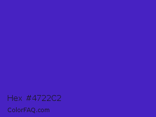 Hex #4722c2 Color is a normal indigo color and the nearest color is Interdimensional Blue #360ccc. Hex code #4722c2 and RGB value is rgb(71,34,194). In RGB color space, this color is composed of 28% red, 13% green, 76% blue, In CMYK color space, this color is composed of 63% cyan, 82% magenta, 0% yellow , 24% black , In HSL color space, this color has a hue angle of 254° , 70% saturation and 45% lightness.