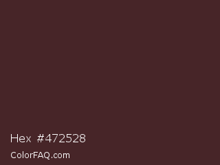 Hex #472528 Color is a very dark red color and the nearest color is Crater Brown #462425. Hex code #472528 and RGB value is rgb(71,37,40). In RGB color space, this color is composed of 28% red, 15% green, 16% blue, In CMYK color space, this color is composed of 0% cyan, 48% magenta, 44% yellow , 72% black , In HSL color space, this color has a hue angle of 355° , 31% saturation and 21% lightness.