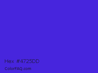 Hex #4725dd Color is a normal indigo color and the nearest color is Han Purple #5218fa. Hex code #4725dd and RGB value is rgb(71,37,221). In RGB color space, this color is composed of 28% red, 15% green, 87% blue, In CMYK color space, this color is composed of 68% cyan, 83% magenta, 0% yellow , 13% black , In HSL color space, this color has a hue angle of 251° , 73% saturation and 51% lightness.