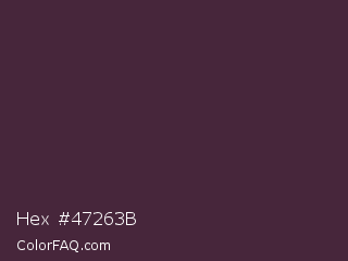Hex #47263b Color is a very dark magenta color and the nearest color is Livid Brown #4d282e. Hex code #47263b and RGB value is rgb(71,38,59). In RGB color space, this color is composed of 28% red, 15% green, 23% blue, In CMYK color space, this color is composed of 0% cyan, 46% magenta, 17% yellow , 72% black , In HSL color space, this color has a hue angle of 322° , 30% saturation and 21% lightness.