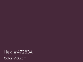 Hex #47283a Color is a very dark magenta color and the nearest color is Woody Brown #483131. Hex code #47283a and RGB value is rgb(71,40,58). In RGB color space, this color is composed of 28% red, 16% green, 23% blue, In CMYK color space, this color is composed of 0% cyan, 44% magenta, 18% yellow , 72% black , In HSL color space, this color has a hue angle of 325° , 28% saturation and 22% lightness.