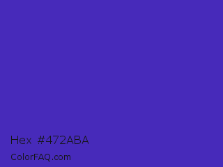 Hex #472aba Color is a normal indigo color and the nearest color is Ocean Blue #4f42b5. Hex code #472aba and RGB value is rgb(71,42,186). In RGB color space, this color is composed of 28% red, 16% green, 73% blue, In CMYK color space, this color is composed of 62% cyan, 77% magenta, 0% yellow , 27% black , In HSL color space, this color has a hue angle of 252° , 63% saturation and 45% lightness.