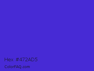 Hex #472ad5 Color is a normal indigo color and the nearest color is Interdimensional Blue #360ccc. Hex code #472ad5 and RGB value is rgb(71,42,213). In RGB color space, this color is composed of 28% red, 16% green, 84% blue, In CMYK color space, this color is composed of 67% cyan, 80% magenta, 0% yellow , 16% black , In HSL color space, this color has a hue angle of 250° , 67% saturation and 50% lightness.