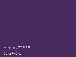 Hex #472b5e Color is a dark purple color and the nearest color is Bossanova #4e2a5a. Hex code #472b5e and RGB value is rgb(71,43,94). In RGB color space, this color is composed of 28% red, 17% green, 37% blue, In CMYK color space, this color is composed of 24% cyan, 54% magenta, 0% yellow , 63% black , In HSL color space, this color has a hue angle of 273° , 37% saturation and 27% lightness.