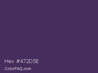 Hex #472d5e Color is a dark purple color and the nearest color is Bossanova #4e2a5a. Hex code #472d5e and RGB value is rgb(71,45,94). In RGB color space, this color is composed of 28% red, 18% green, 37% blue, In CMYK color space, this color is composed of 24% cyan, 52% magenta, 0% yellow , 63% black , In HSL color space, this color has a hue angle of 272° , 35% saturation and 27% lightness.