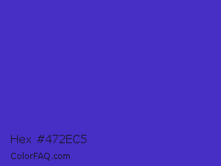 Hex #472ec5 Color is a normal indigo color and the nearest color is Ocean Blue #4f42b5. Hex code #472ec5 and RGB value is rgb(71,46,197). In RGB color space, this color is composed of 28% red, 18% green, 77% blue, In CMYK color space, this color is composed of 64% cyan, 77% magenta, 0% yellow , 23% black , In HSL color space, this color has a hue angle of 250° , 62% saturation and 48% lightness.