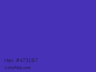 Hex #4731b7 Color is a normal indigo color and the nearest color is Ocean Blue #4f42b5. Hex code #4731b7 and RGB value is rgb(71,49,183). In RGB color space, this color is composed of 28% red, 19% green, 72% blue, In CMYK color space, this color is composed of 61% cyan, 73% magenta, 0% yellow , 28% black , In HSL color space, this color has a hue angle of 250° , 58% saturation and 45% lightness.
