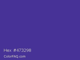 Hex #473298 Color is a normal indigo color and the nearest color is Gigas #523c94. Hex code #473298 and RGB value is rgb(71,50,152). In RGB color space, this color is composed of 28% red, 20% green, 60% blue, In CMYK color space, this color is composed of 53% cyan, 67% magenta, 0% yellow , 40% black , In HSL color space, this color has a hue angle of 252° , 50% saturation and 40% lightness.