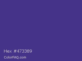 Hex #473389 Color is a normal indigo color and the nearest color is Dark Slate Blue #483d8b. Hex code #473389 and RGB value is rgb(71,51,137). In RGB color space, this color is composed of 28% red, 20% green, 54% blue, In CMYK color space, this color is composed of 48% cyan, 63% magenta, 0% yellow , 46% black , In HSL color space, this color has a hue angle of 254° , 46% saturation and 37% lightness.