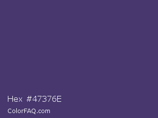 Hex #47376e Color is a normal indigo color and the nearest color is Jacarta #3a2a6a. Hex code #47376e and RGB value is rgb(71,55,110). In RGB color space, this color is composed of 28% red, 22% green, 43% blue, In CMYK color space, this color is composed of 35% cyan, 50% magenta, 0% yellow , 57% black , In HSL color space, this color has a hue angle of 257° , 33% saturation and 32% lightness.