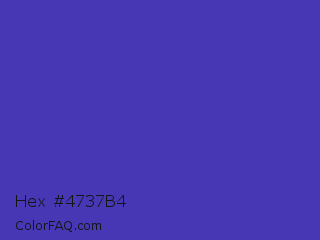 Hex #4737b4 Color is a normal indigo color and the nearest color is Ocean Blue #4f42b5. Hex code #4737b4 and RGB value is rgb(71,55,180). In RGB color space, this color is composed of 28% red, 22% green, 71% blue, In CMYK color space, this color is composed of 61% cyan, 69% magenta, 0% yellow , 29% black , In HSL color space, this color has a hue angle of 248° , 53% saturation and 46% lightness.