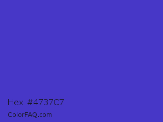 Hex #4737c7 Color is a normal indigo color and the nearest color is Ocean Blue #4f42b5. Hex code #4737c7 and RGB value is rgb(71,55,199). In RGB color space, this color is composed of 28% red, 22% green, 78% blue, In CMYK color space, this color is composed of 64% cyan, 72% magenta, 0% yellow , 22% black , In HSL color space, this color has a hue angle of 247° , 57% saturation and 50% lightness.