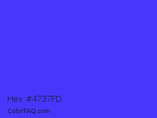 Hex #4737fd Color is a normal indigo color and the nearest color is Han Purple #5218fa. Hex code #4737fd and RGB value is rgb(71,55,253). In RGB color space, this color is composed of 28% red, 22% green, 99% blue, In CMYK color space, this color is composed of 72% cyan, 78% magenta, 0% yellow , 1% black , In HSL color space, this color has a hue angle of 245° , 98% saturation and 60% lightness.