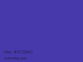 Hex #4739ac Color is a normal indigo color and the nearest color is Ocean Blue #4f42b5. Hex code #4739ac and RGB value is rgb(71,57,172). In RGB color space, this color is composed of 28% red, 22% green, 67% blue, In CMYK color space, this color is composed of 59% cyan, 67% magenta, 0% yellow , 33% black , In HSL color space, this color has a hue angle of 247° , 50% saturation and 45% lightness.