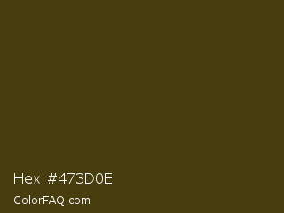 Hex #473d0e Color is a very dark yellow color and the nearest color is Bronzetone #4d400f. Hex code #473d0e and RGB value is rgb(71,61,14). In RGB color space, this color is composed of 28% red, 24% green, 5% blue, In CMYK color space, this color is composed of 0% cyan, 14% magenta, 80% yellow , 72% black , In HSL color space, this color has a hue angle of 49° , 67% saturation and 17% lightness.