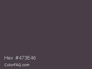 Hex #473e46 Color is a dark magenta color and the nearest color is Tundora #4a4244. Hex code #473e46 and RGB value is rgb(71,62,70). In RGB color space, this color is composed of 28% red, 24% green, 27% blue, In CMYK color space, this color is composed of 0% cyan, 13% magenta, 1% yellow , 72% black , In HSL color space, this color has a hue angle of 307° , 7% saturation and 26% lightness.