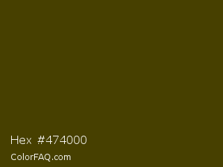 Hex #474000 Color is a very dark yellow color and the nearest color is Bronze Olive #4e420c. Hex code #474000 and RGB value is rgb(71,64,0). In RGB color space, this color is composed of 28% red, 25% green, 0% blue, In CMYK color space, this color is composed of 0% cyan, 10% magenta, 100% yellow , 72% black , In HSL color space, this color has a hue angle of 54° , 100% saturation and 14% lightness.