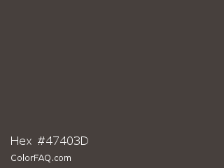 Hex #47403d Color is a dark orange color and the nearest color is Armadillo #433e37. Hex code #47403d and RGB value is rgb(71,64,61). In RGB color space, this color is composed of 28% red, 25% green, 24% blue, In CMYK color space, this color is composed of 0% cyan, 10% magenta, 14% yellow , 72% black , In HSL color space, this color has a hue angle of 18° , 8% saturation and 26% lightness.