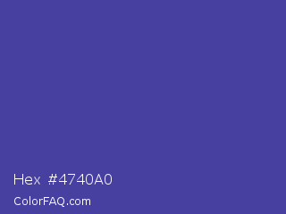 Hex #4740a0 Color is a normal indigo color and the nearest color is Gigas #523c94. Hex code #4740a0 and RGB value is rgb(71,64,160). In RGB color space, this color is composed of 28% red, 25% green, 63% blue, In CMYK color space, this color is composed of 56% cyan, 60% magenta, 0% yellow , 37% black , In HSL color space, this color has a hue angle of 244° , 43% saturation and 44% lightness.
