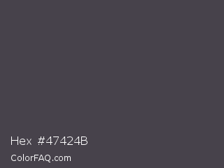 Hex #47424b Color is a dark purple color and the nearest color is Gravel #4a444b. Hex code #47424b and RGB value is rgb(71,66,75). In RGB color space, this color is composed of 28% red, 26% green, 29% blue, In CMYK color space, this color is composed of 5% cyan, 12% magenta, 0% yellow , 71% black , In HSL color space, this color has a hue angle of 273° , 6% saturation and 28% lightness.