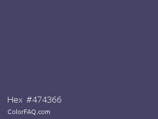 Hex #474366 Color is a normal indigo color and the nearest color is Mulled Wine #4e4562. Hex code #474366 and RGB value is rgb(71,67,102). In RGB color space, this color is composed of 28% red, 26% green, 40% blue, In CMYK color space, this color is composed of 30% cyan, 34% magenta, 0% yellow , 60% black , In HSL color space, this color has a hue angle of 247° , 21% saturation and 33% lightness.