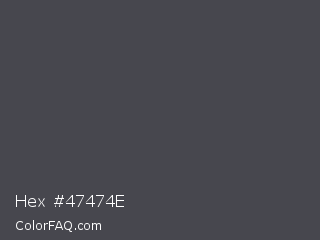 Hex #47474e Color is a dark blue color and the nearest color is Gravel #4a444b. Hex code #47474e and RGB value is rgb(71,71,78). In RGB color space, this color is composed of 28% red, 28% green, 31% blue, In CMYK color space, this color is composed of 9% cyan, 9% magenta, 0% yellow , 69% black , In HSL color space, this color has a hue angle of 240° , 5% saturation and 29% lightness.