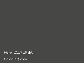 Hex #474846 Color is a dark green color and the nearest color is Tundora #4a4244. Hex code #474846 and RGB value is rgb(71,72,70). In RGB color space, this color is composed of 28% red, 28% green, 27% blue, In CMYK color space, this color is composed of 1% cyan, 0% magenta, 3% yellow , 72% black , In HSL color space, this color has a hue angle of 90° , 1% saturation and 28% lightness.