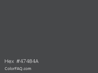 Hex #47484a Color is a dark blue color and the nearest color is Gravel #4a444b. Hex code #47484a and RGB value is rgb(71,72,74). In RGB color space, this color is composed of 28% red, 28% green, 29% blue, In CMYK color space, this color is composed of 4% cyan, 3% magenta, 0% yellow , 71% black , In HSL color space, this color has a hue angle of 220° , 2% saturation and 28% lightness.