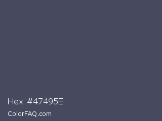 Hex #47495e Color is a normal blue color and the nearest color is River Bed #434c59. Hex code #47495e and RGB value is rgb(71,73,94). In RGB color space, this color is composed of 28% red, 29% green, 37% blue, In CMYK color space, this color is composed of 24% cyan, 22% magenta, 0% yellow , 63% black , In HSL color space, this color has a hue angle of 235° , 14% saturation and 32% lightness.