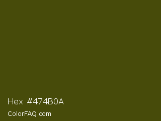 Hex #474b0a Color is a very dark yellow color and the nearest color is Bronze Olive #4e420c. Hex code #474b0a and RGB value is rgb(71,75,10). In RGB color space, this color is composed of 28% red, 29% green, 4% blue, In CMYK color space, this color is composed of 5% cyan, 0% magenta, 87% yellow , 71% black , In HSL color space, this color has a hue angle of 64° , 76% saturation and 17% lightness.