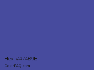 Hex #474b9e Color is a normal blue color and the nearest color is Victoria #534491. Hex code #474b9e and RGB value is rgb(71,75,158). In RGB color space, this color is composed of 28% red, 29% green, 62% blue, In CMYK color space, this color is composed of 55% cyan, 53% magenta, 0% yellow , 38% black , In HSL color space, this color has a hue angle of 237° , 38% saturation and 45% lightness.
