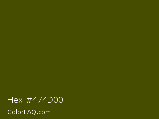 Hex #474d00 Color is a very dark yellow color and the nearest color is Verdun Green #495400. Hex code #474d00 and RGB value is rgb(71,77,0). In RGB color space, this color is composed of 28% red, 30% green, 0% blue, In CMYK color space, this color is composed of 8% cyan, 0% magenta, 100% yellow , 70% black , In HSL color space, this color has a hue angle of 65° , 100% saturation and 15% lightness.