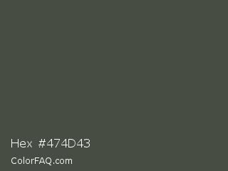 Hex #474d43 Color is a dark green color and the nearest color is Outer Space #414a4c. Hex code #474d43 and RGB value is rgb(71,77,67). In RGB color space, this color is composed of 28% red, 30% green, 26% blue, In CMYK color space, this color is composed of 8% cyan, 0% magenta, 13% yellow , 70% black , In HSL color space, this color has a hue angle of 96° , 7% saturation and 28% lightness.